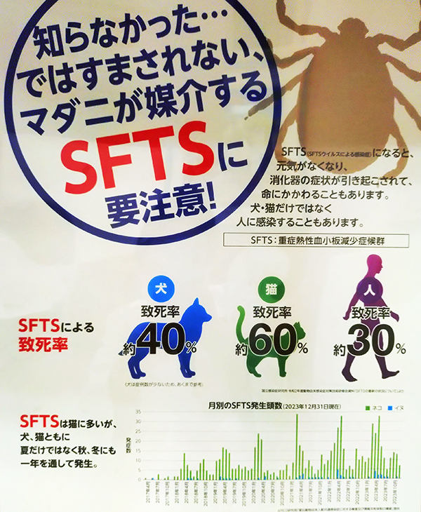 さらに近年国内で増加しているのが、マダニがウイルスを媒介するSFTS(重症熱性血小板減少症候群)です。犬や猫での発症例、死亡例もさることながら、人に感染してしまい、人命にかかわる病気のため特に注意が必要とされています。